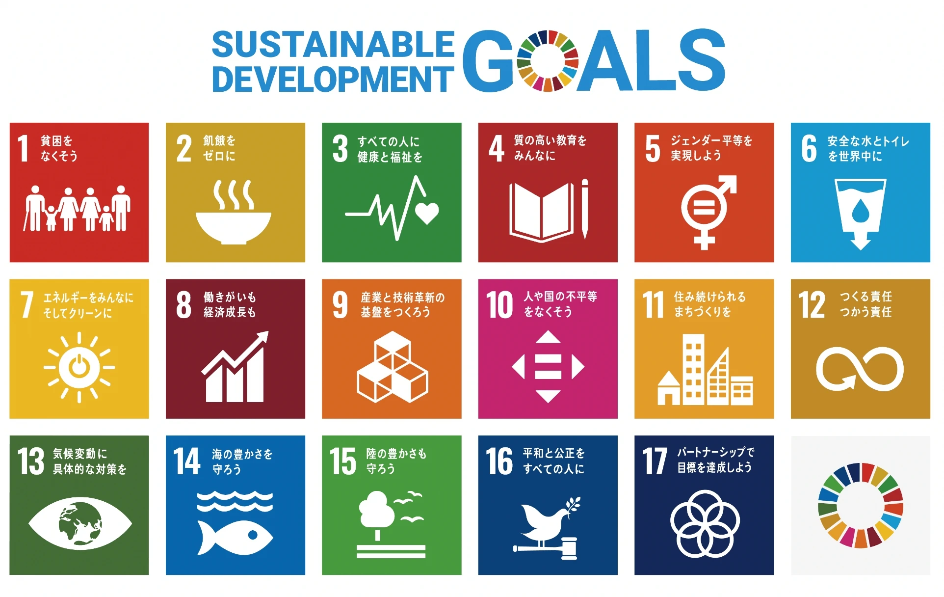 (SustainableDevelopmentGoals:SDGs)」はあらゆる国と地域が、貧困や不平等、教育、環境などに関連する2030年までに達成するべき17の目標です。地球上の様々な課題解決を図り、誰一人取り残さないより良い国際社会の実現を理念として掲げています。
