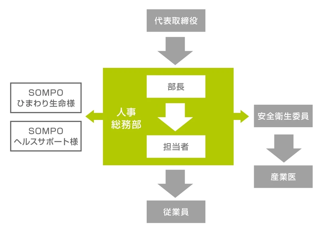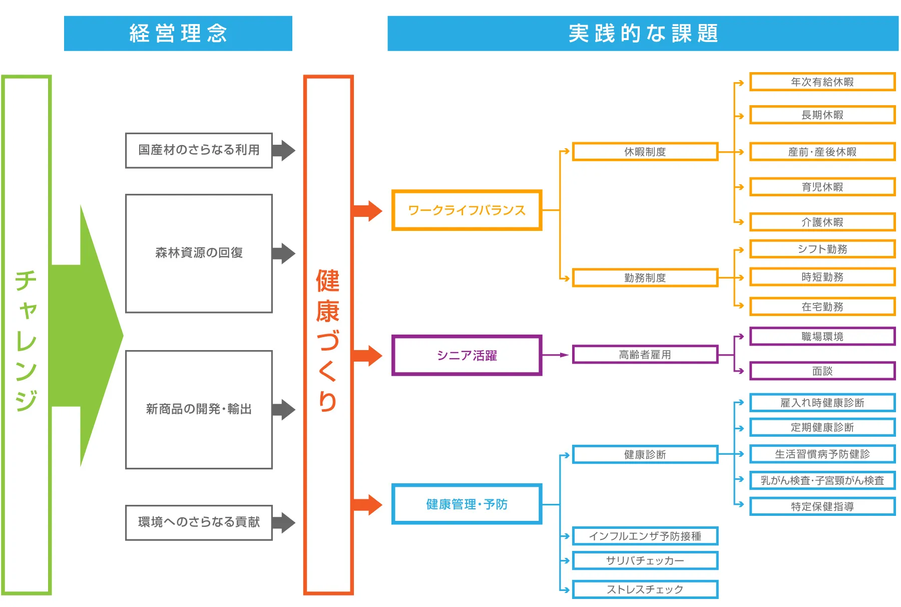 私たち中国木材グループは、社員一人ひとりの心身の健康を尊重し安全に働ける職場環境を整備するとともに、社員の心身の健康づくりをサポートします。