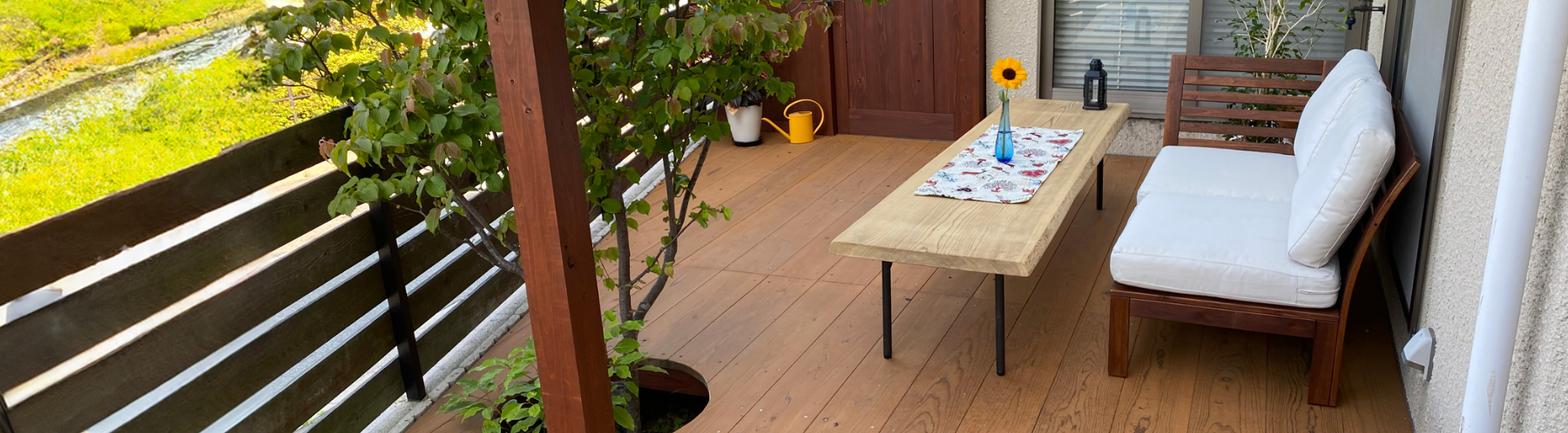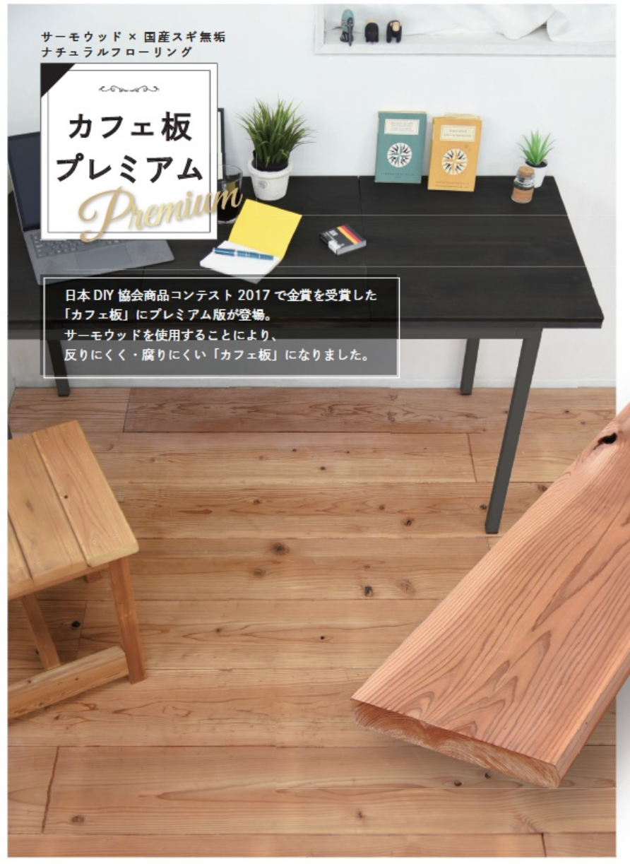 従来の「カフェ板(国産スギ無垢)」にサーモウッドを使用することにより、反りにくく、腐りにくい「カフェ板」に!
