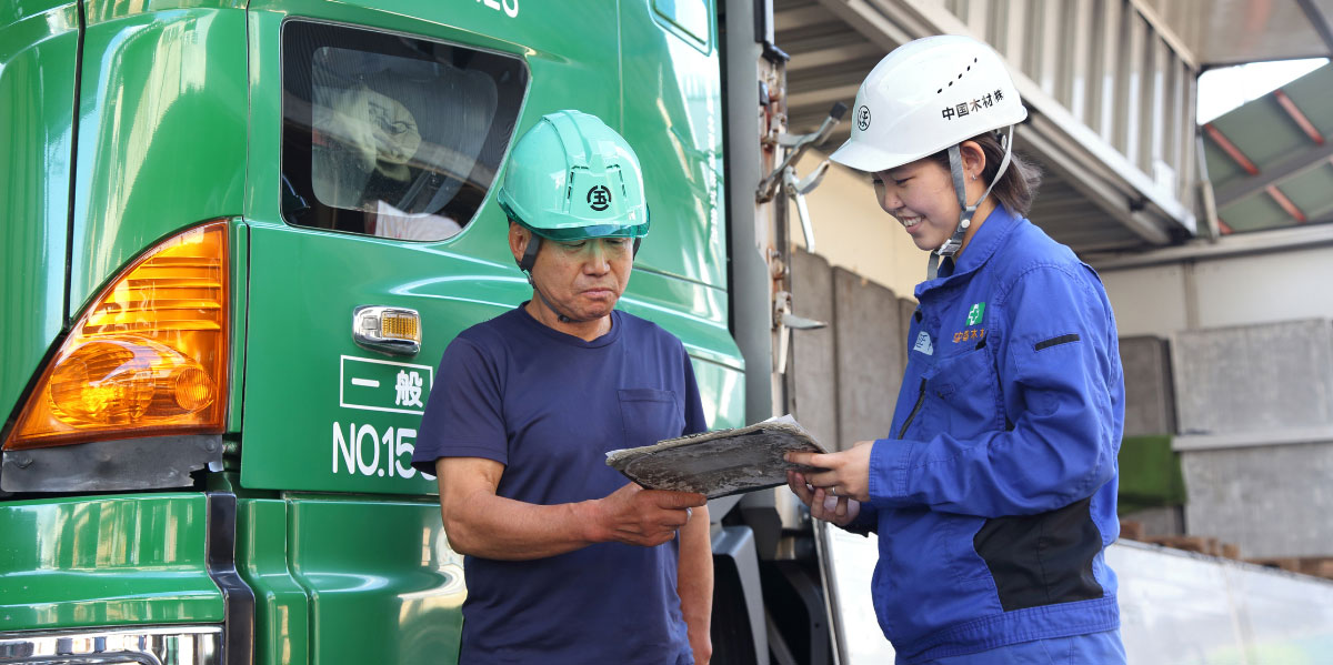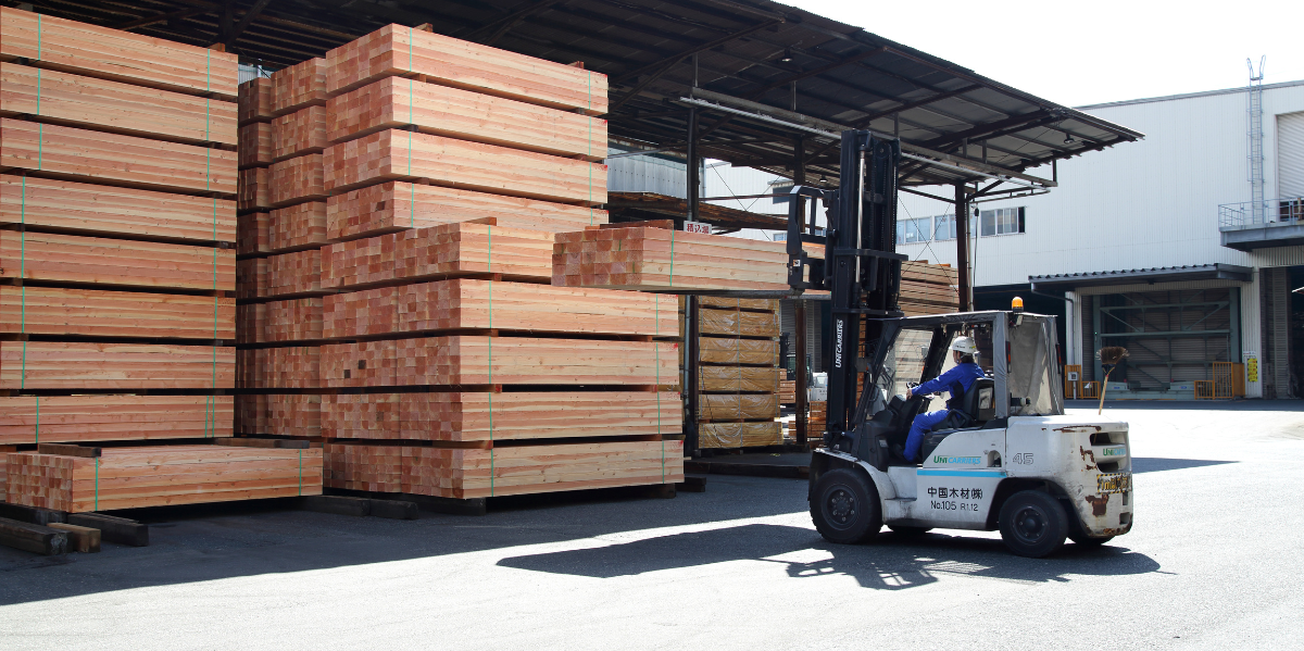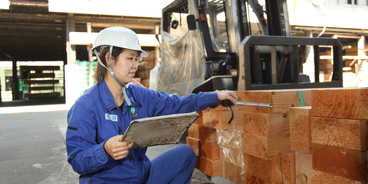 現在はフォークリフトに乗って、出荷する製品をトラックに積み込む作業を担当しています。受注手配をする部署から、トラックごとに積み込む製品のリストが届くので、倉庫から指定のものを集めトラックに積んでいきます。ほとんどがひとまとめに梱包されていますが、バラで積む製品もあります。バラ製品が含まれているときには 1 本 1 本厚みや幅を測り、間違えないよう確認しながら作業しています。入社して最初の 1 年は、バラ材の梱包作業をしていましたが、いろいろな先輩の仕事を見ているうちに「私ならこうやって積み込む…」と考えるようになりました。そこからフォークリフトの免許を取り、積み込みの仕事に挑戦しました。最初は怖かったのですが、今では楽しく感じています。いずれは大型のフォークリフトに挑戦する予定です。
